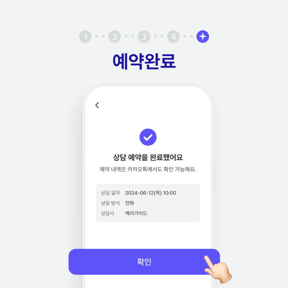 예약이 완료되면 날짜, 방식, 담당자 정보를 확인할 수 있어요.