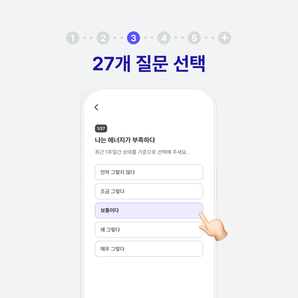 마지막 질문까지 응답하면 내 점수를 확인할 수 있어요. 지금 상태를 기반으로 한 회복 목표도 곧바로 제안됩니다.