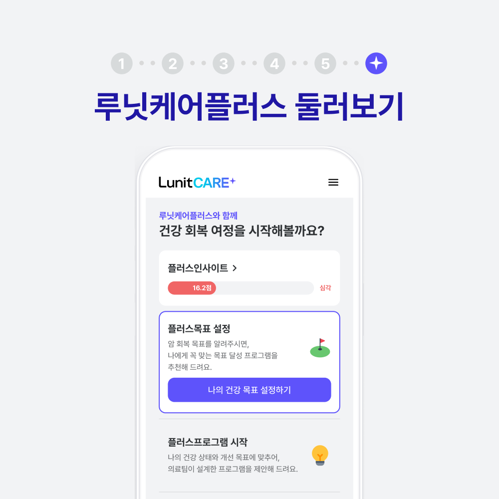 이제 루닛케어플러스를 시작하러 가보세요 홈에서 건강 목표를 설정하고 프로그램을 이어가실 수 있어요.